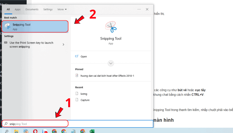 - Nhập “Snipping Tool” vào thanh tìm kiếm trên taskbar và nhấp vào kết quả hiển thị.
