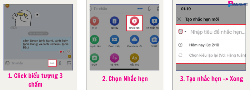 Tiếp theo, bạn chọn Nhắc hẹn (có biểu tượng đồng hồ), nhập nội dung ghi chú, chọn thời gian cần nhắc rồi bấm Xong. Đến thời điểm đó, Zalo sẽ gửi thông báo nhắc nhở cho bạn và người nhận.