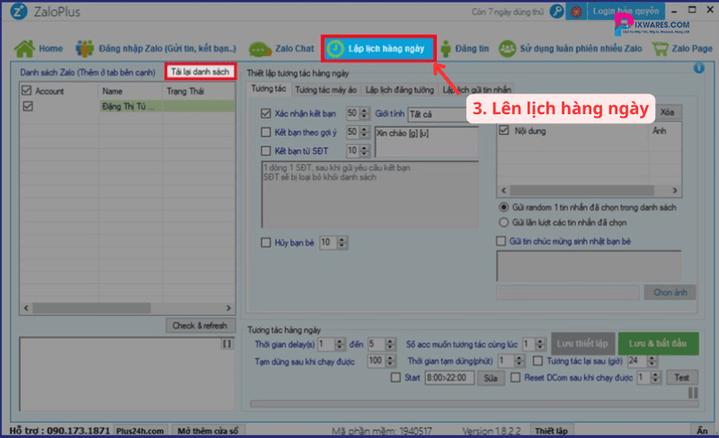 Bước 3: Bây giờ, bạn sẽ thấy một thanh công cụ trên giao diện phần mềm, hãy tìm đến chức năng Lập lịch hàng ngày và nhấp vào đó. Tiếp theo, nhấn vào Tải lại danh sách để phần mềm cập nhật danh sách liên hệ mới nhất của bạn.