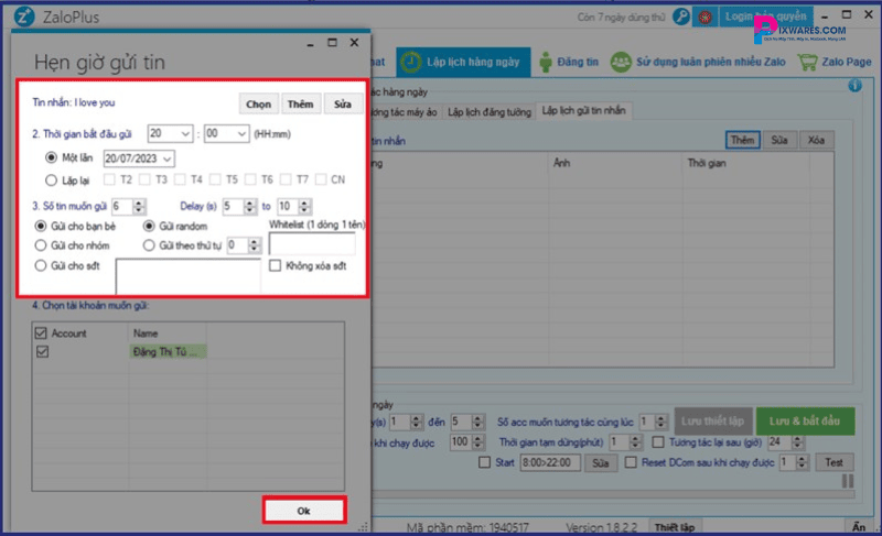Bước 5: Tiếp theo, bạn cần thiết lập thời gian gửi tin nhắn. Ở đây, bạn có thể chọn gửi một lần duy nhất vào ngày giờ cụ thể hoặc gửi nhiều lần theo lịch trình cố định. Bạn cũng có thể thiết lập độ trễ giữa các tin nhắn, số lượng tin nhắn gửi đi, cũng như chọn nhóm hoặc bạn bè cụ thể để nhận tin nhắn này.