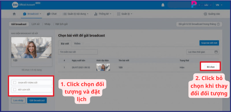 Bước 2: Lúc này, bạn sẽ cần soạn nội dung tin nhắn hoặc chọn một bài viết có sẵn trong tài khoản OA của bạn. Tiếp theo, bạn bấm vào Chọn đối tượng gửi và tiến hành đặt lịch gửi theo thời gian mong muốn.