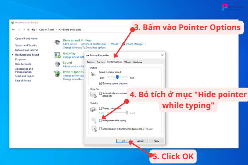 3. Trong giao diện của Mouse Propertise, bạn tìm đến Tab Pointer Options > Bỏ tích ở mục “Hide pointer while typing” > Nhấn OK để lưu thay đổi và kiểm tra xem nó có khắc phục được hay là không nhé!