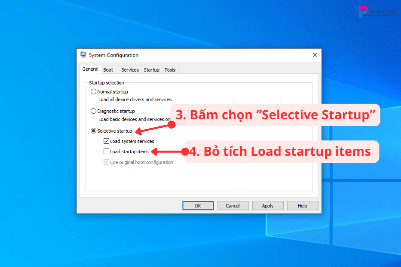 2. Trong tab General, chọn Selective Startup, sau đó:
