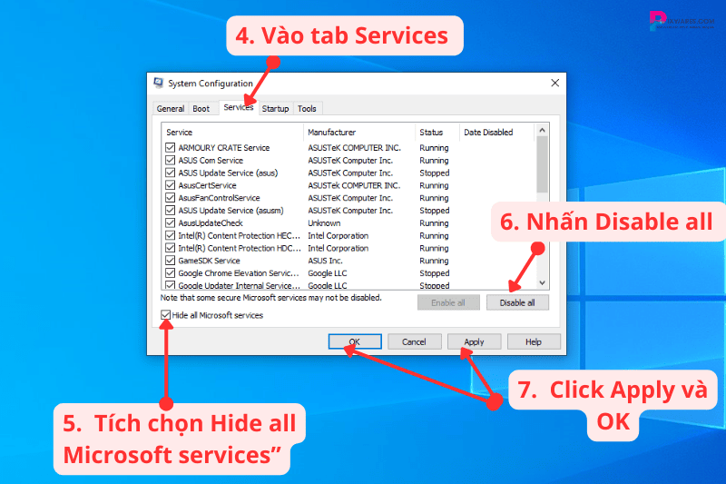 3. Chuyển sang tab Services > tích chọn Hide all Microsoft services > sau đó nhấn Disable all. > Nhấn Apply và OK, sau đó khởi động lại máy tính.