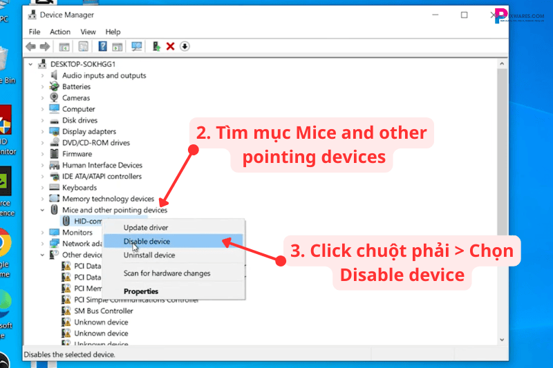 2. Tìm mục Mice and other pointing devices > Nhấp chuột phải vào thiết bị Touchpad (thường có ký hiệu TP). > Chọn Disable để vô hiệu hóa Touchpad.