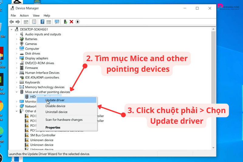 2. Tìm đến mục Mice and other pointing devices. > Nhấp chuột phải vào từng thiết bị trong danh sách và chọn Update driver.