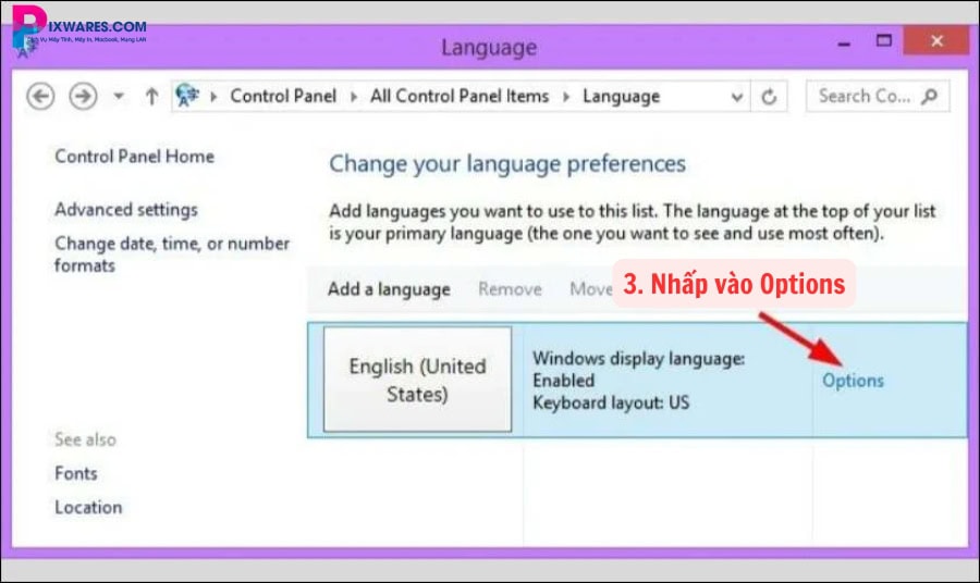 Bước 3: Tại danh sách ngôn ngữ đang sử dụng (ví dụ: Vietnamese), nhấn vào Options