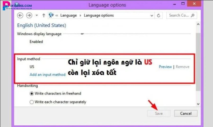 Bước 6: Sau khi thêm xong, bạn quay lại danh sách bàn phím. Nhấn Remove tất cả các kiểu bàn phím không cần thiết như Vietnamese Telex, VNI, French, v.v.
