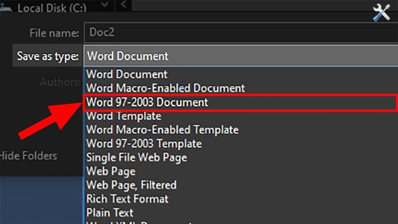 Khi cửa sổ Save As mở ra, bạn nhìn xuống dưới sẽ thấy mục Save as type. Nhấn vào đó, một danh sách các định dạng file sẽ hiện ra. Bạn chọn Word 97-2003 Document (*.doc) để đảm bảo file tương thích tốt hơn.