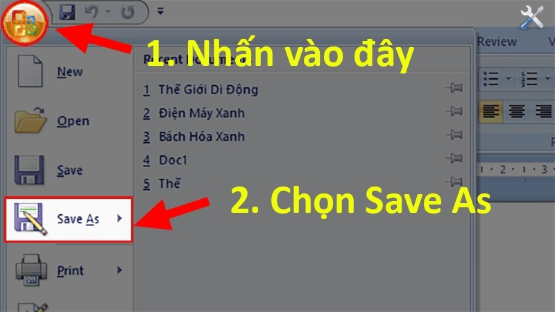 Đầu tiên, bạn mở file Word mà bạn muốn lưu. Sau đó, nhìn lên góc trên cùng bên trái màn hình, nhấn vào nút Microsoft Office (hình tròn). Khi menu hiện ra, chọn mục Save As để tiếp tục.