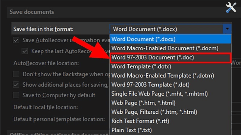 Trong phần Save Documents, bạn để ý dòng Save files in this format. Nhấn vào ô danh sách thả xuống bên cạnh, rồi chọn Word 97-2003 Document (*.doc).