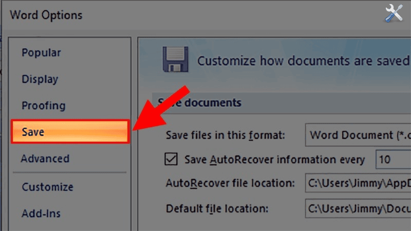 Khi cửa sổ Word Options hiện lên, bạn nhìn vào danh sách bên trái và nhấn vào tab Save. Đây là nơi bạn có thể điều chỉnh các tùy chọn liên quan đến việc lưu file.