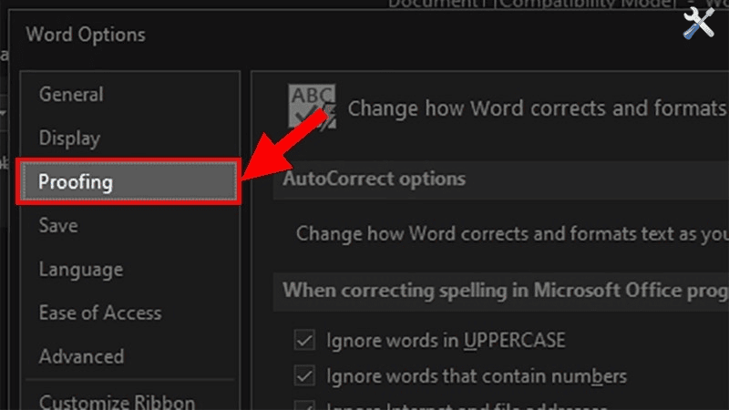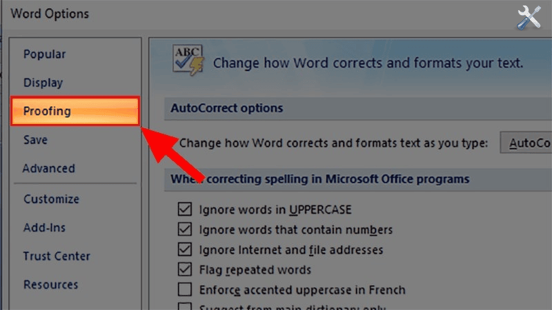 Trong hộp thoại Word Options, chọn mục Proofing ở danh sách bên trái.