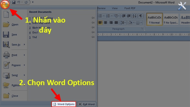 Bạn nhấn vào nút Microsoft Office (ở góc trên cùng bên trái màn hình). Khi menu hiện ra, bạn chọn mục Word Options để truy cập vào cài đặt.