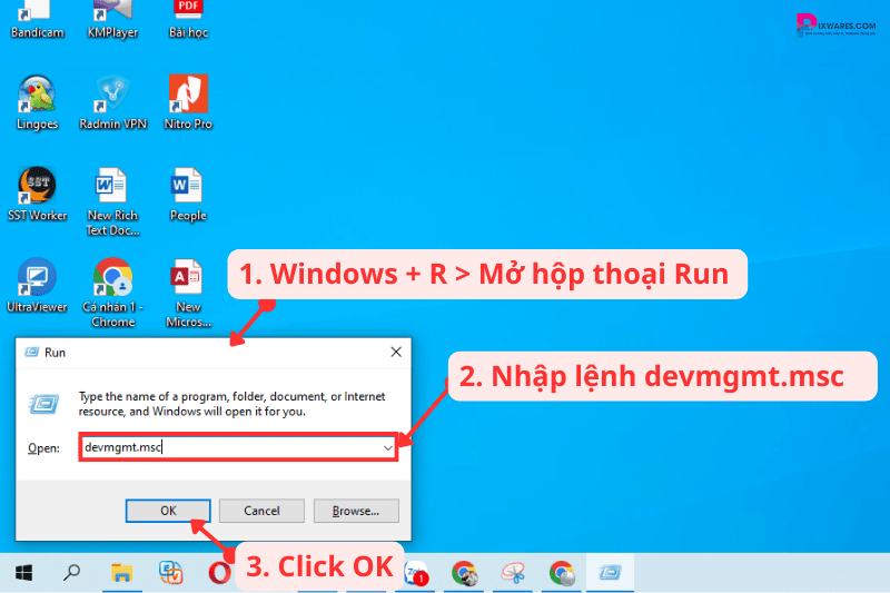 Bước 1: Truy cập Device Manager bằng cách nhấn tổ hợp phím Windows + R để mở hộp thoại Run > Nhập lệnh devmgmt.msc > Nhấn OK để mở Device Manager.