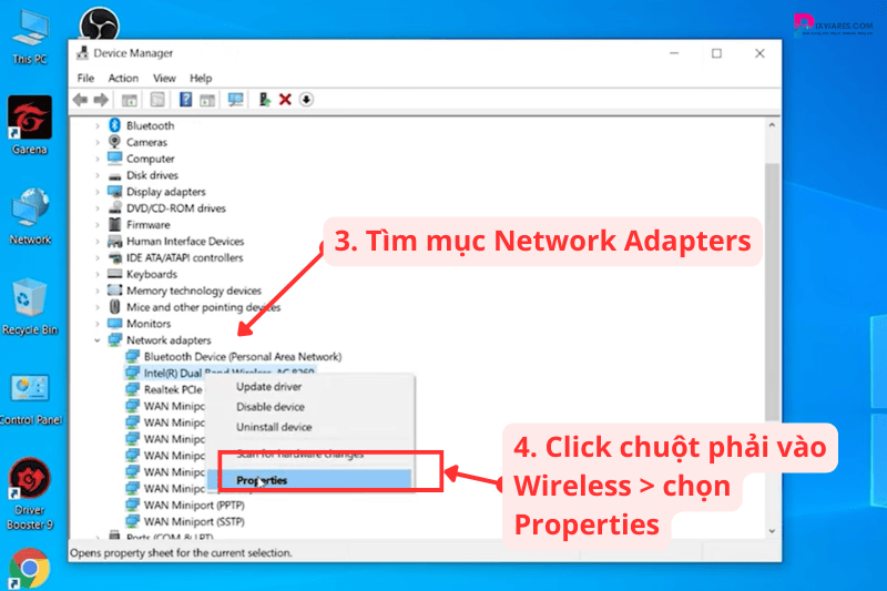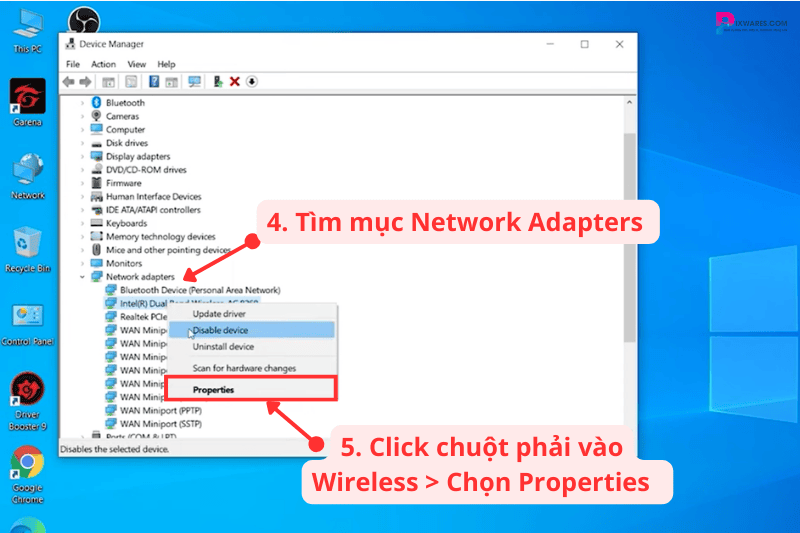 Bước 2: Trong cửa sổ Device Manager, tìm mục Network Adapters và nhấn vào dấu mũi tên để mở rộng danh sách. Tìm thiết bị Wireless Adapter (thường có tên chứa từ “Wireless” hoặc “Wi-Fi”), nhấp chuột phải và chọn Properties.