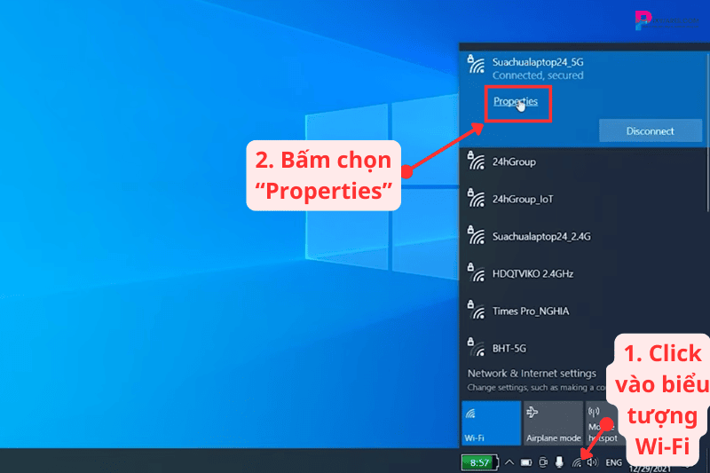 Bước 1: Nhấn vào biểu tượng Wi-Fi nằm trên thanh Taskbar ở góc dưới cùng bên phải màn hình. > Tìm tên mạng Wi-Fi mà bạn đang kết nối, nhấp chuột phải và chọn Properties (Thuộc tính).