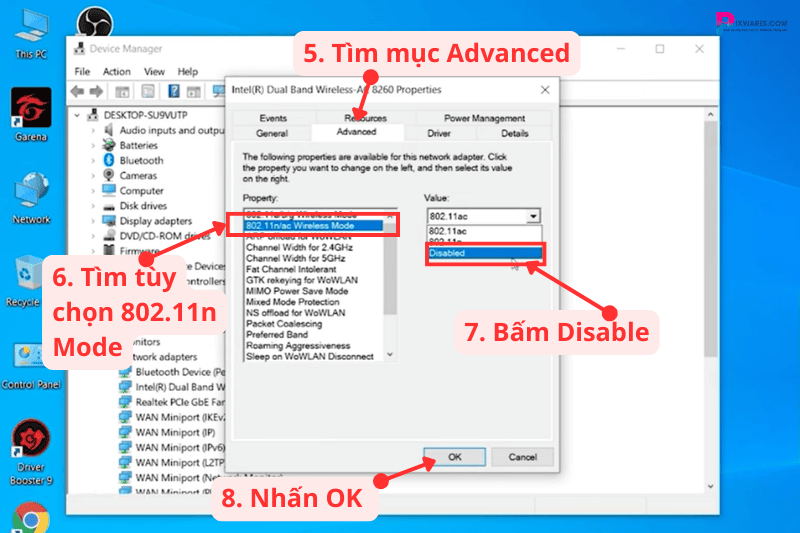 Bước 3: Trong cửa sổ Properties, chuyển sang tab Advanced. > Tìm tùy chọn 802.11n Mode trong danh sách Property. > Trong mục Value, chọn Disable (Vô hiệu hóa) để tắt chế độ này.
