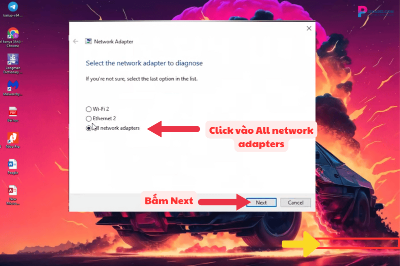 Sau đó, ứng dụng sẽ hỏi bạn đang gặp lỗi ở kết nối mạng nào: Wi-Fi hay mạng dây. Nếu bạn không rành, có thể chọn tất cả các mạng như mình để đảm bảo trường hợp bạn muốn sửa lỗi cho mạng dây cũng sử dụng được.