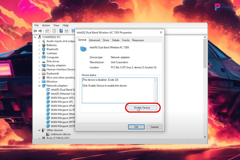 Bước 2: Ở dòng Device Status, nếu thấy driver đang ở trạng thái “Disabled“, để bật driver Wi-Fi lên, bạn hãy nhấp vào ô “Enable Device.”