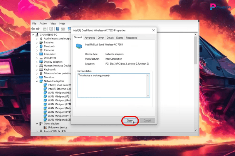 Trong tab Device Manager, chú ý ở mục Network Adapter. Bạn sẽ thấy “Intel Dual Band Wireless” đang có biểu tượng hình tròn với dấu mũi tên chỉ xuống báo hiệu driver này đang bị ẩn. Để chắc hơn, hãy nhấp chuột phải vào mục này và chọn Properties.
