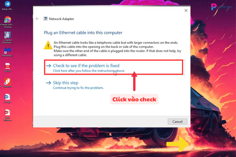 Bước 2: Sau đó, nhấn “Next” để tiếp tục chẩn đoán. Ứng dụng báo rằng kết nối mạng chưa được kết nối và hướng dẫn bạn cách kết nối và kiểm tra kết nối mạng đã đúng hay chưa. Tuy nhiên, vì mình đang cần sửa lỗi Wi-Fi nên mình sẽ bỏ qua thông báo này và tiếp tục nhấn “Check to see if the problem is fixed”.