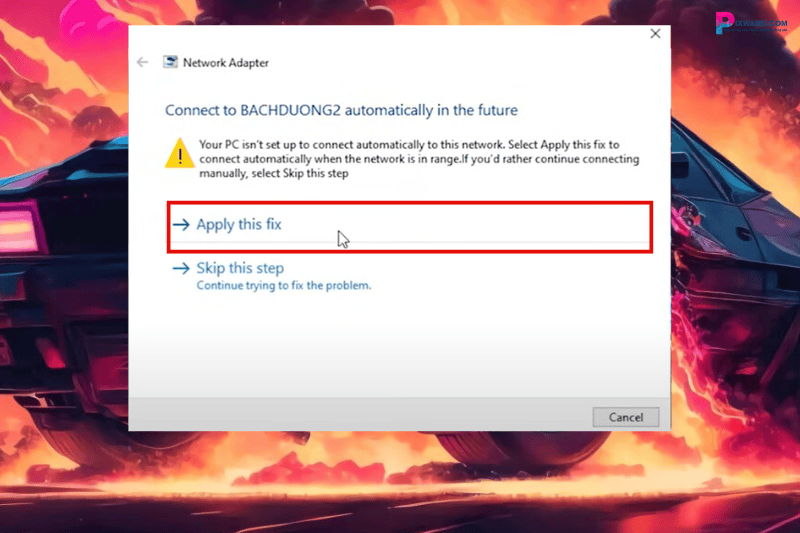 Bước 2: Thông báo hiện lên rằng PC không được cài đặt tự động kết nối với mạng này nên mới phát sinh lỗi. Đề xuất chúng ta sửa lỗi bằng cách tùy chỉnh cho PC tự động kết nối với mạng này trong tương lai. Bạn nhấn vào “Apply this fix” để tiến hành sửa lỗi này nhé.