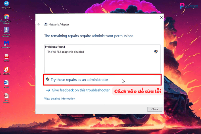 Bước 3: Tiếp theo, ứng dụng sẽ thông báo rằng driver Wi-Fi đã bị vô hiệu hoá (The Wi-Fi 2 adapter is disabled), nên mới phát sinh lỗi. Bạn bấm vào “Try these repairs as an administrator” để đồng ý và sửa lỗi này nhé. Quá trình sửa lỗi sẽ mất ít phút.
