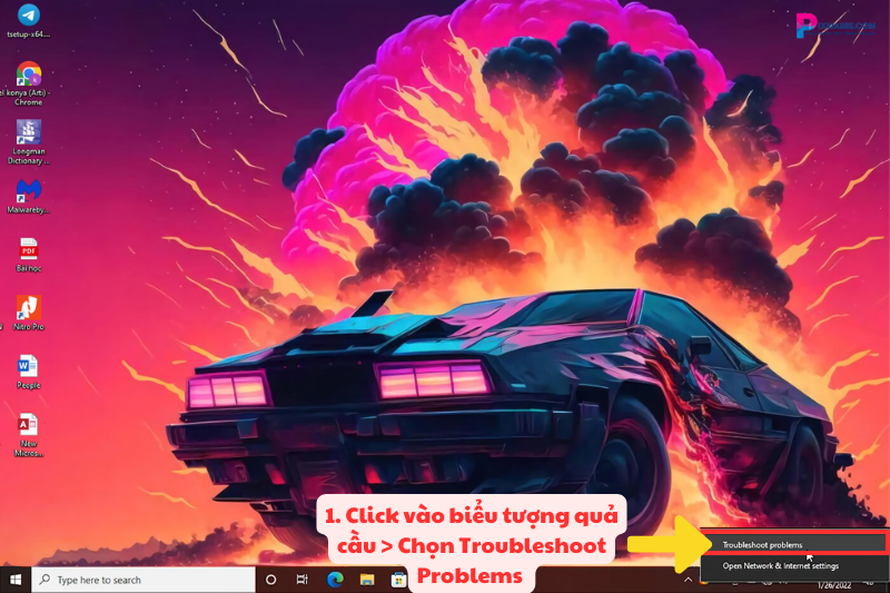Bước 1: Đầu tiên, với cách sửa đổi đơn giản nhất, ở biểu tượng hình quả cầu với hình tròn gạch chéo, các bạn nhấp chuột phải vào và chọn “Troubleshoot Problems” để chạy chẩn đoán của Windows. Ứng dụng sẽ tìm lỗi trong ít phút.