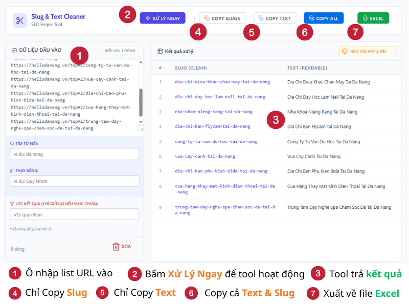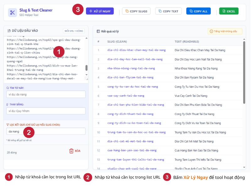 - Copy Slugs / Copy Text: Chỉ sao chép riêng cột Slug hoặc riêng cột Text readable vào bộ nhớ tạm để dán nhanh vào các công cụ nghiên cứu từ khóa khác (như Ahrefs, SEMrush…).