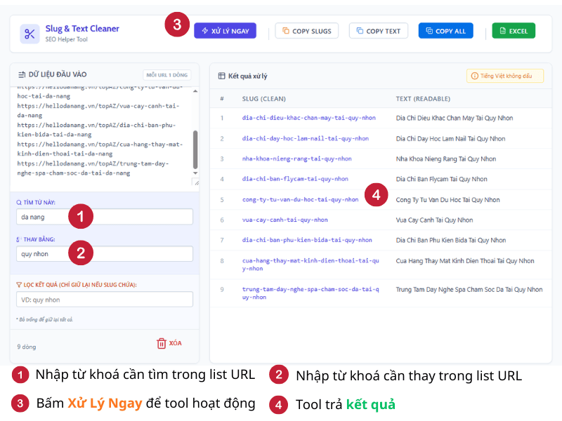 - Ví dụ: Nếu bạn nhập “quy nhon”, công cụ sẽ chỉ hiển thị các kết quả mà trong Slug cuối cùng có chứa cụm từ “quy-nhon”. Các dòng không chứa sẽ bị ẩn đi.