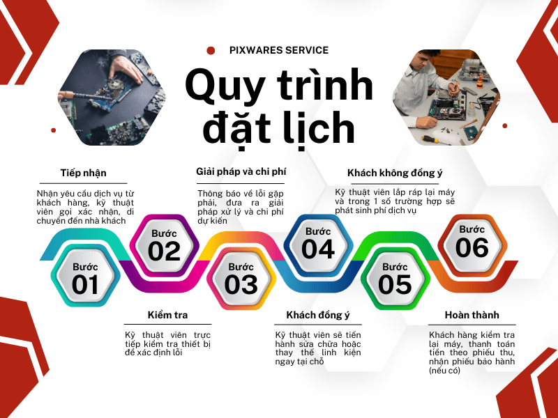 Khi máy tính của bạn gặp sự cố, hãy liên hệ ngay với Pixwares để được hỗ trợ sửa chữa tại nhà nhanh chóng và tiện lợi. Chúng tôi cam kết đem lại cho khách hàng trải nghiệm dịch vụ tốt nhất với giá cả ưu đãi thông qua quy trình sửa chữa 6 bước chuyên nghiệp và có hệ thống như sau: