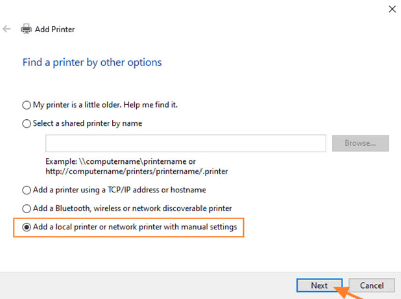 - Chọn Add a local printer or network printer with manual settings, rồi nhấn Next.