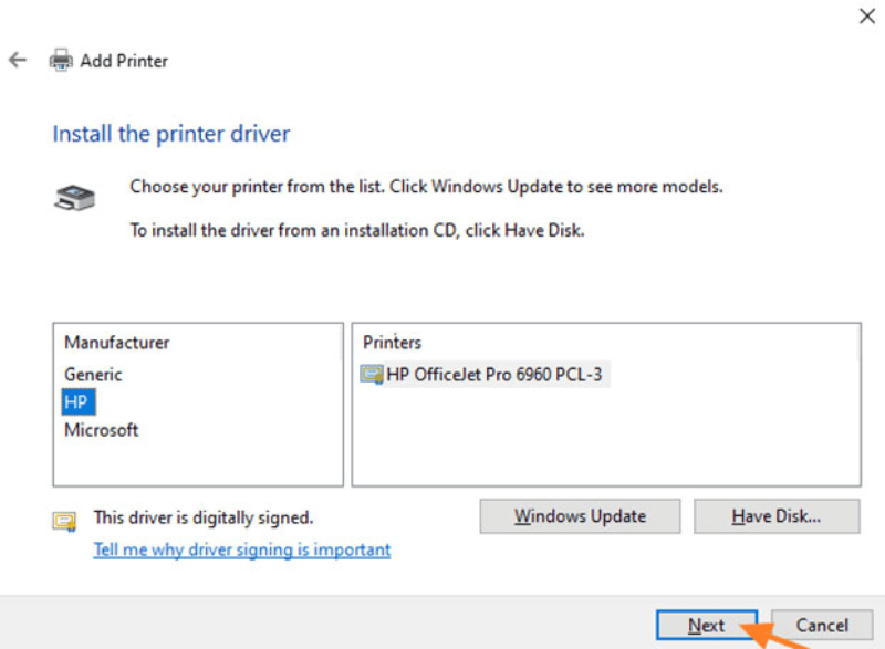 - Trong danh sách hiện ra, chọn đúng model máy in mạng và nhấp vào Next.