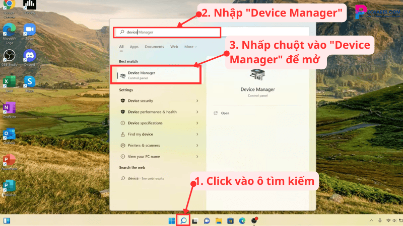 Nếu sau tất cả những bước trên mà camera vẫn không hoạt động, việc cập nhật driver cho camera sẽ là phương án cuối cùng mà bạn có thể thử. Đầu tiên, bạn mở “Device Manager” bằng cách nhập vào ô tìm kiếm.