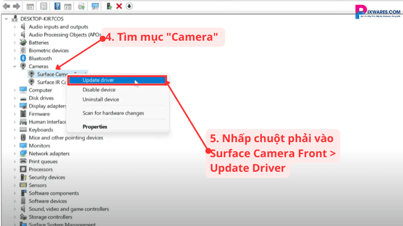 Sau đó, nhấp chuột phải vào tên camera “Surface Camera Front” và chọn “Update driver“.