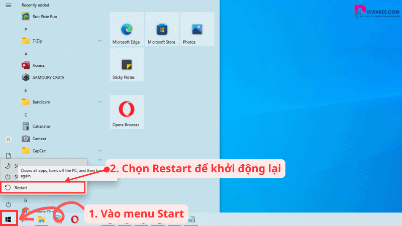 Để khởi động lại máy, các bạn chỉ cần nhấn vào menu Start, sau đó chọn biểu tượng Power và chọn Restart. Sau khi máy tính khởi động lại, hãy kiểm tra xem camera đã hoạt động hay chưa nhé!