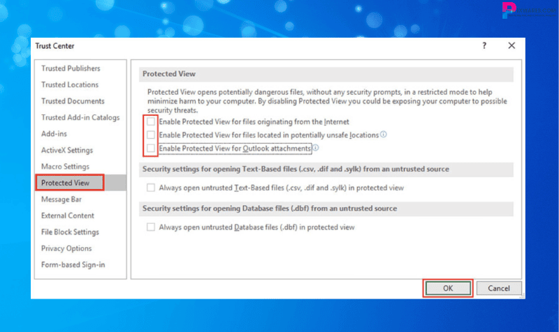 3. Trong cửa sổ Trust Center, chọn mục Protected View từ danh sách bên trái.