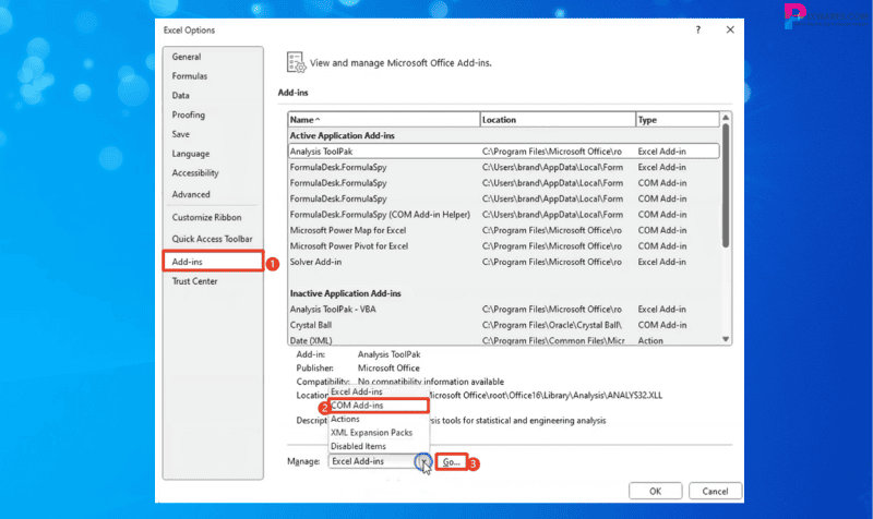 5. Ở phần dưới cùng, chọn COM Add-ins từ danh sách thả xuống và nhấp vào Go.