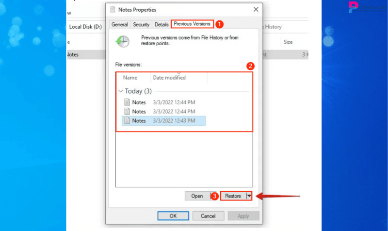 2. Chuyển sang tab Previous Versions. Nếu tính năng File History đã được bật trước đó, bạn sẽ thấy danh sách các phiên bản cũ của file.