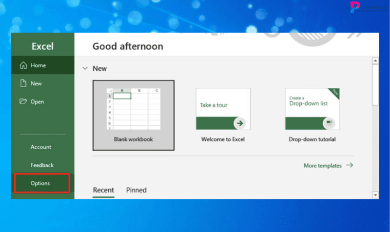1. Mở Microsoft Excel và nhấp vào File ở góc trên cùng bên trái. Sau đó chọn Options ở cuối thanh menu bên trái.