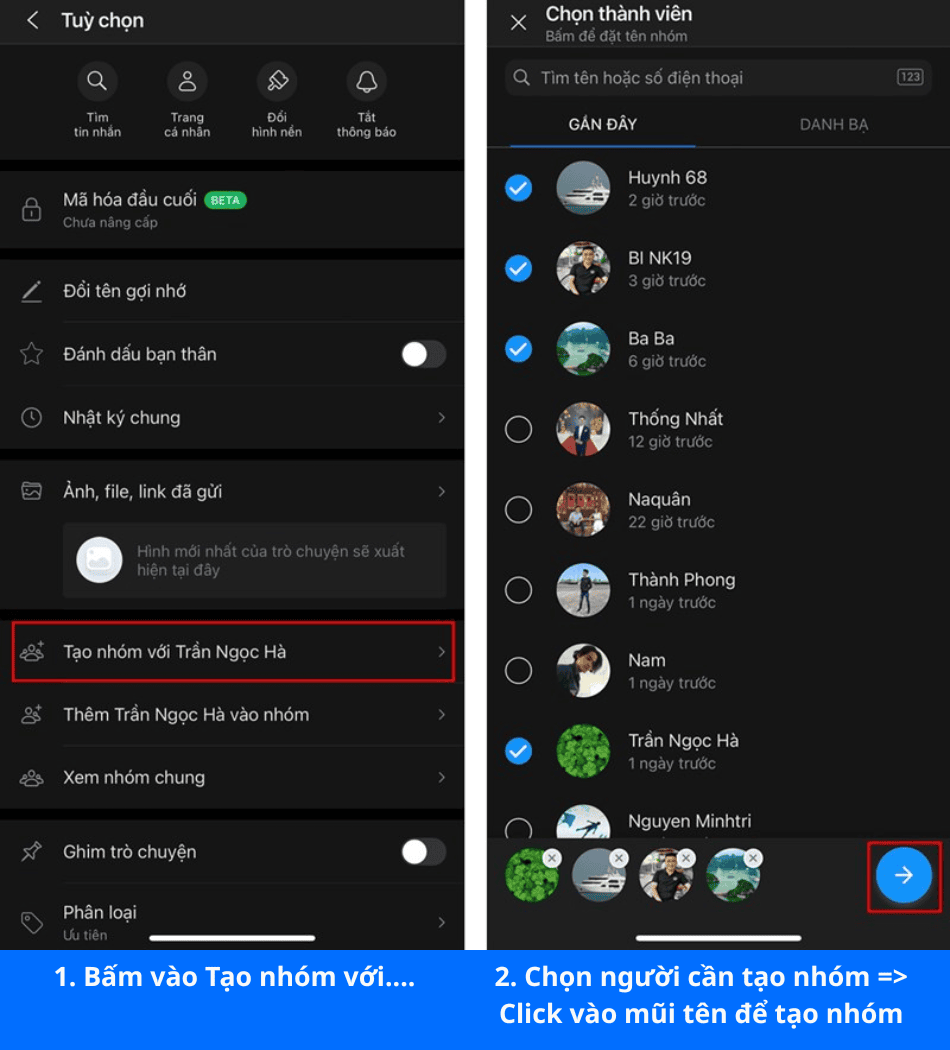 Tại đây, hãy tick chọn những thành viên muốn thêm vào nhóm. Sau khi chọn xong, anh chị nhấn vào biểu tượng mũi tên chuyển tiếp để xác nhận và hoàn tất quá trình tạo nhóm.