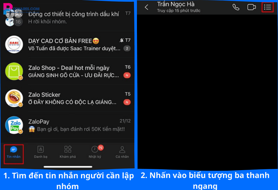 Trước tiên, truy cập vào ứng dụng Zalo, chọn mục Tin nhắn, sau đó tìm đến cuộc trò chuyện với người mà anh chị muốn thêm vào nhóm chung.